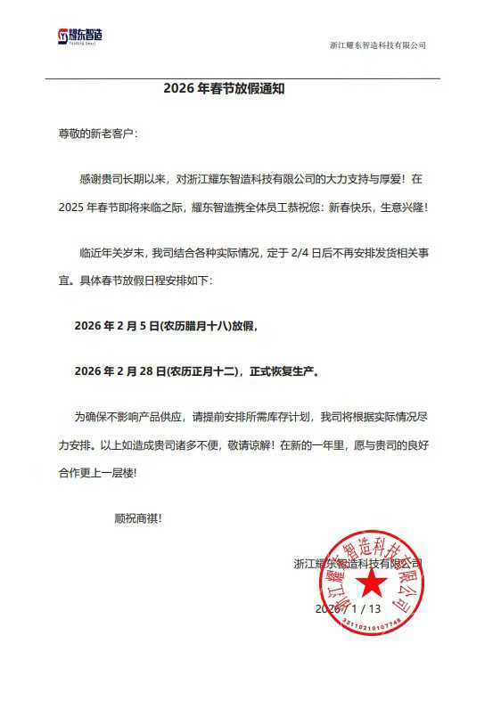 (Zhejiang, [tarikh semasa]) Menjelang Tahun Baru Imlek, pelbagai industri telah memulakan kajian semula tahunan dan tempoh rehat mereka. Hari ini, Zhejiang Yaodong Smart Manufacturing Technology Co., Ltd. secara rasmi mengeluarkan jadual operasi Festival Musim Bunga, menandakan kejayaan usaha pengeluaran dan penghantaran 2025 serta permulaan pecut terakhir sebelum cuti.